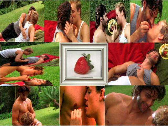 Toby ran his hand down Kevin's back, he pulled him close and they kissed hungrily. Kevin's hand twined into the locks of Toby's dark hair. As they laid there on the blanket Toby picked up a big ripe strawberry from the fruit plate he had set out. He teased it against Kevin's full bottom lip. He leaned in and pretended to nip at the berry himself. Kevin ate the berry then selected another. With one hand on the back of Toby's neck Kevin fed him a bite of berry then ate the other half. Toby moaned in pleasure.