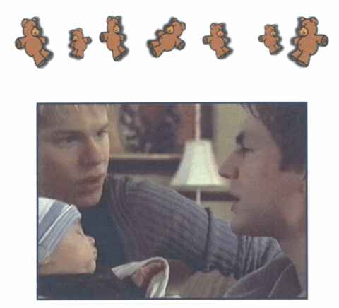 Justins lap the two boys hugged each other tight and Brian pushed the